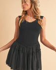 This sleeveless mini dress features charming frill details and a trendy drop waist silhouette. The playful design adds a touch of fun and flair to your wardrobe. Stay stylish and comfortable in this frill sleeveless drop waist mini dress.