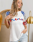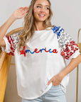 Make a patriotic statement with this eye-catching "America" letter applique spangle puff sleeves top. The bold applique adds a fun and festive touch to this stylish piece. The puff sleeves bring a touch of femininity and charm to the top. Perfect for celebrating special occasions like Independence Day or showing off your American pride year-round. Pair it with jeans or shorts for a chic and trendy look that will make you stand out.