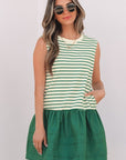This sleeveless mini dress has a flowy woven body and a fun mix of stripes and ruffles on the bodice and skirt. It's a must-have for effortless and stylish summer days.