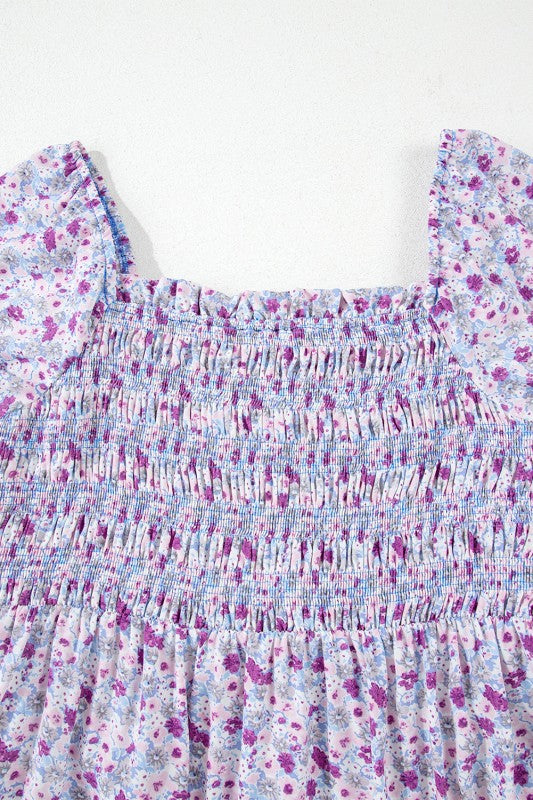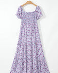 Floral Bubble Sleeve Shirred High Waist Maxi Dress