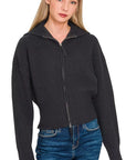Zenana Ribbed Collared Zip Up Sweater Cardigan in Black